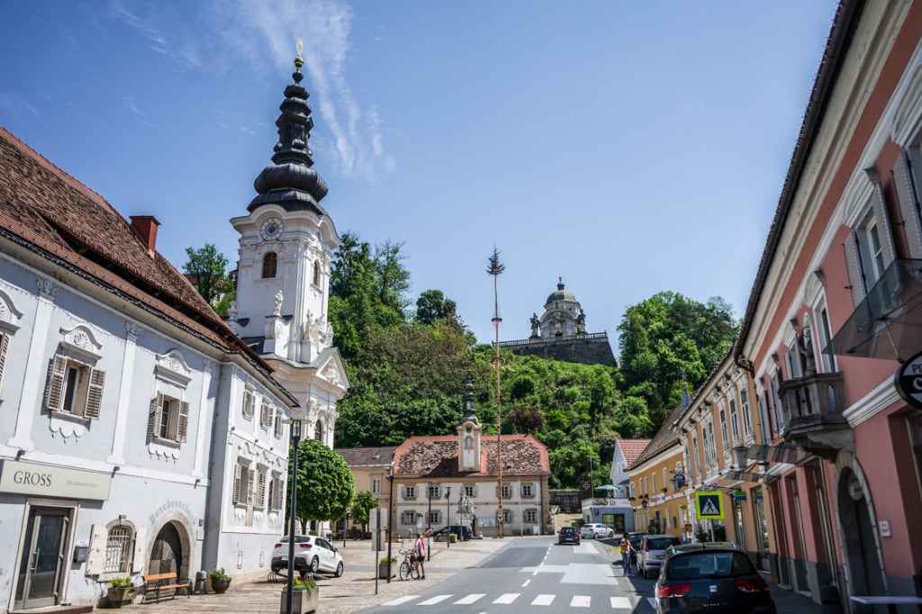 Staro mestno jedro v Gamlitzu je vseeno večje kot v Ehrenhausnu, a ni tako strjeno. V strogem centru pa sva opazila lepo renovirane starejše zgradbe, kužno znamenje in kot vsepovsod osrednjo cerkev. Najbolj naju je zanimal grad, ki ima korenine že v 1111. Danes se da v njem prespati, priljubljen je kot poročna lokacija, v notranjem dvorišču pa lahko tudi kaj okusnega pojeste ali si privoščite kozarec lokalnega vina.