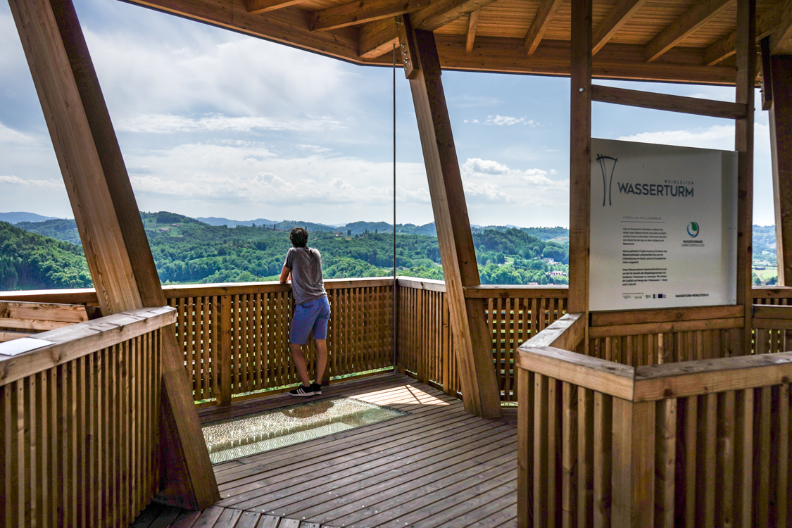 While admiring the wievs from the Ehrenhausen mausoleum, we spotted a tower on a nearby hill. We drove there and found a beautiful wooden tower. Once up we were surprised by a glass balcony and 360 view over the hills around. Next to the tower is a big wooden building, we learned later that’s a water reservoir. You can download an app, where you can learn about water and how it circulates on our planet.
