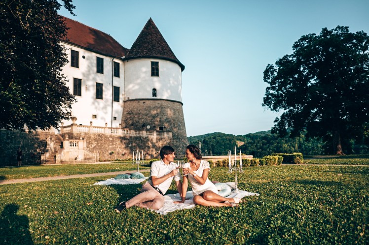 Prispela sva med prvimi (saj veste, točnost je lepa čednost) in takoj v roko dobila kozarec odličnega vina in predjed, ki je bila tako za oko kot za brbončice prava poslastica. Ostali gostje so postopoma kapljali, spoznala sva prijetnega sevniškega župana, med znanimi obrazi se je pojavila tudi Rebeka Dremelj z družbo. Ko smo bili vsi zbrani, so nas pospremili do dolge mize pod mogočnimi kostanji, osvetljene s pisanimi lampijoni. Na jasi pred gradom pa je scena odsevala čisti hedonizem – žametne blazine oblikovane v gnezda na najmehkejših odejah, obdane z visokimi svečniki. Kot bi stopil v drugi svet.