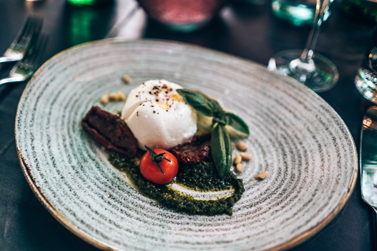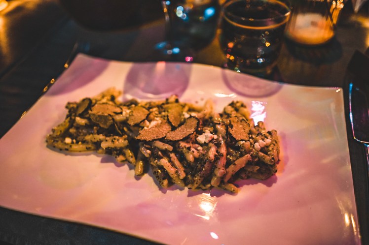 Nato so začele prihajati jedi – prvi, drugi, ne vem kateri že hod. Eden boljši od drugega. In brez skrbi – čeprav sva bila edina vegetarijanca, so odlično poskrbeli za naju. Od odlične italijansko navdihnjene predjedi s suhimi paradižniki, bazilikovim pestom, pinjolami in svežo burato, prek zanimive in edinstvene juhe iz dimljenega sira do glavne jedi, ki so nama jo po vzdihljajih sodeč zavidali tudi mesojedci – pljukanci s tartufi. Vsak hod je seveda spremljalo vrhunsko vino izbranih okoliških vinarn.