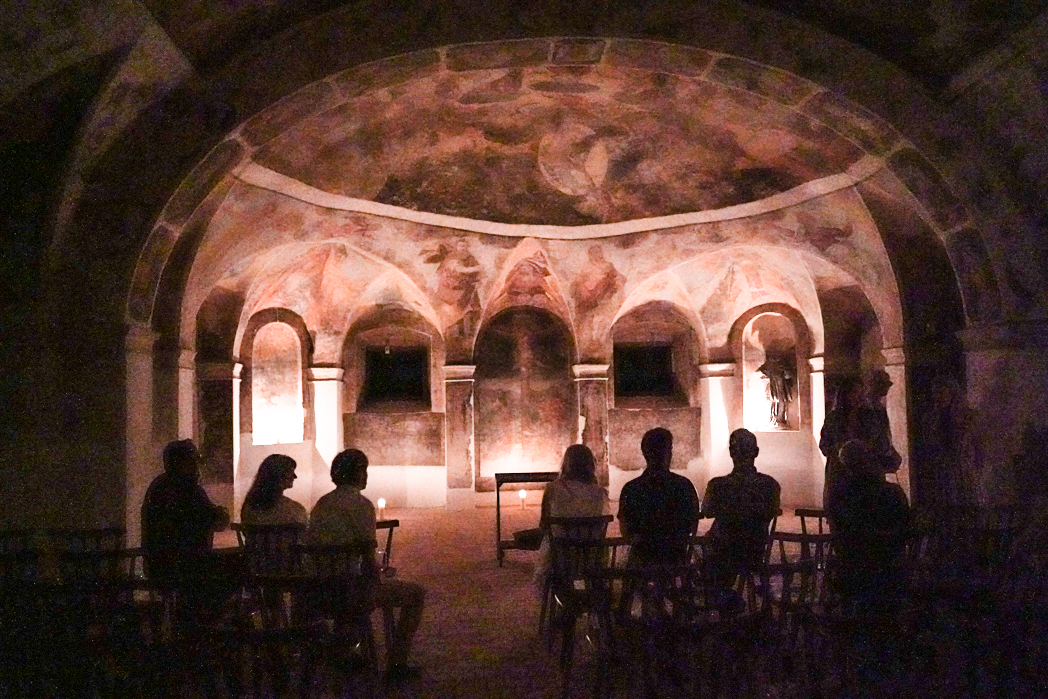 Naenkrat smo se znašli pred grajsko vinsko kletjo. Tam so nam postregli z odlično sladico, ki je bila v bistvu jabolčni zavitek s pridihom jurke, a pripravljena na umetelen način, da mi je bilo prav žal zapičiti vilice v umetnino na krožniku. Med okušanjem sladice in poplakovanjem s še enim odličnim vinom, nas je obiskala poosebljena grofica Matilde, nekdanja lastnica gradu. Vsi smo kar obnemeli ob pogledu na drobno postavo s temnim ogrinjalom in s kapuco zakritim obrazom. Povabila nas je, da spoznamo njenega moža in hčerko. S počasnim korakom smo v četici korakali za njo čez prašne stezice vse do čisto prave kapele. Osvetljena je bila le s svečami. Posedli smo se na klopi in obnemelo poslušali Matildino molitev. Bila je čista tišina, takšna, da bi slišali iglo pasti na tla. Ko je Matilde končala z molitvijo in se poslovila od ljubljenih, je tiho zapustila kapelo, mi pa smo še kar sedeli v tišini. Tak konec je res dal vsakemu od nas možnost dojeti, kako enkraten večer smo imeli čast doživeti. Nekaj trenutkov kasneje so organizatorke prijazno razdelile še spominska darilca – a ste vedeli, da se sevniško jabolko imenuje voščenka? To je bilo namreč lično zavito v darilcu, ki nama je teknilo naslednji dan.